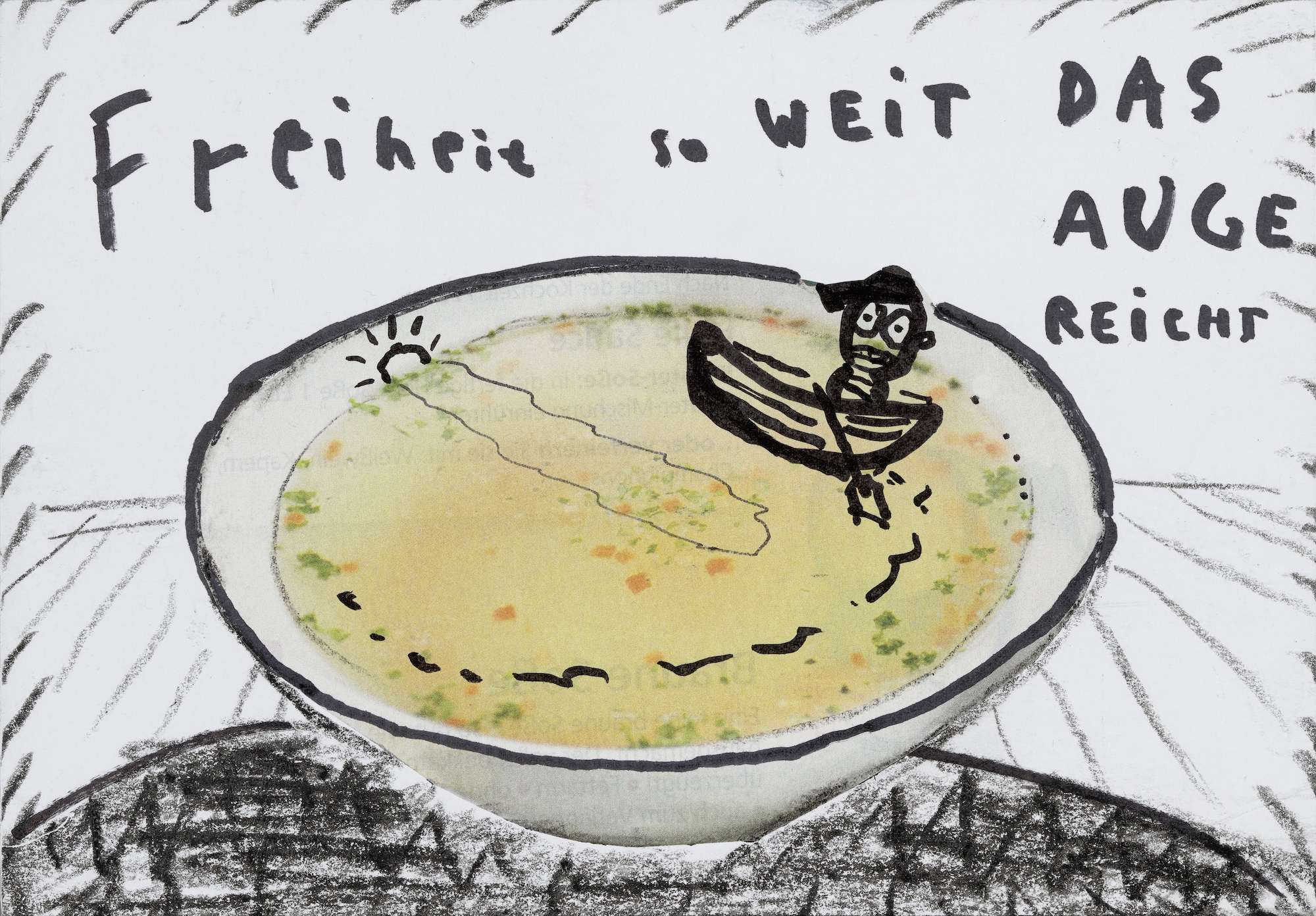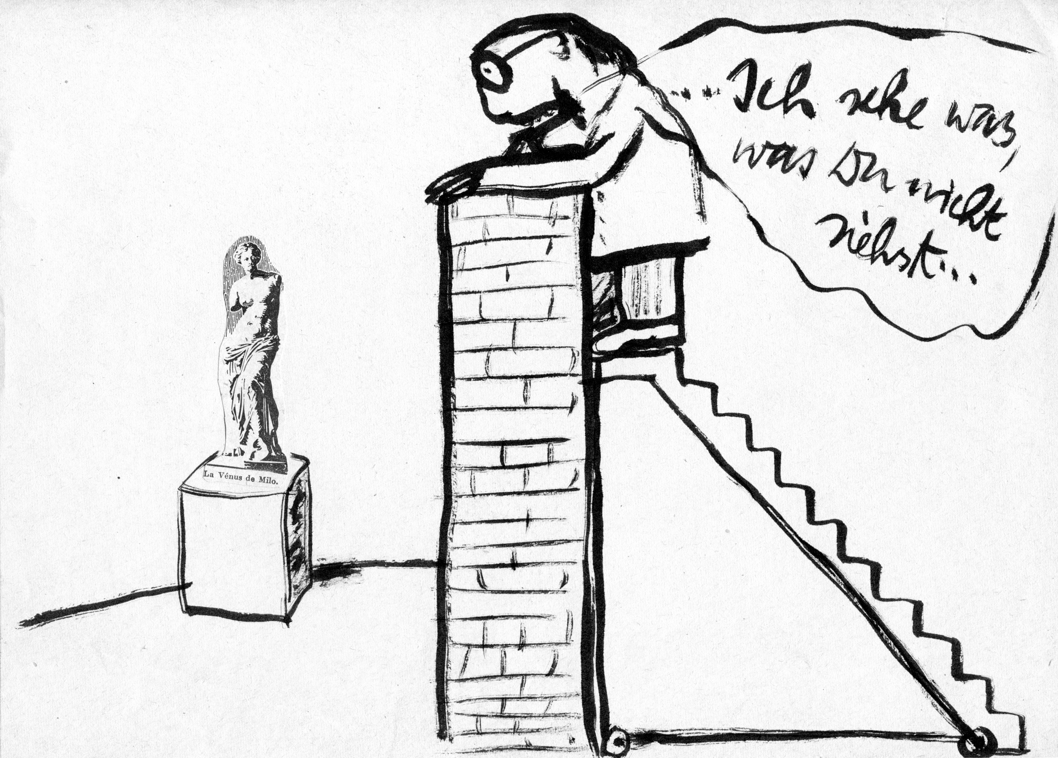 Diesen an Wilhelm Busch geschulten Stil entfaltet Oskar Manigk nun schon seit Jahrzehnten, und das wunderbar gestaltete Lese-Bilderbuch macht die Entwicklung des Genres im Werk von Manigk nachvollziehbar. Zeitlos wirkt diese Arbeit vor allem deshalb, weil Manigk stilistisch schon immer auf Prägnanz und Reduktion setzt, auf eine alle Formvorgaben sprengende Eigensinnigkeit. Inhaltlich spiegeln die Karten gerade in den frühen Jahren das durch Grenzen Beschränkte in der DDR. 'Ich sehe was, was du nicht siehst', sagt ein Mann, der auf einer Leiter steht, über die (Berliner) Mauer blickt und die Venus von Milo sieht – unerreichbar im Louvre..