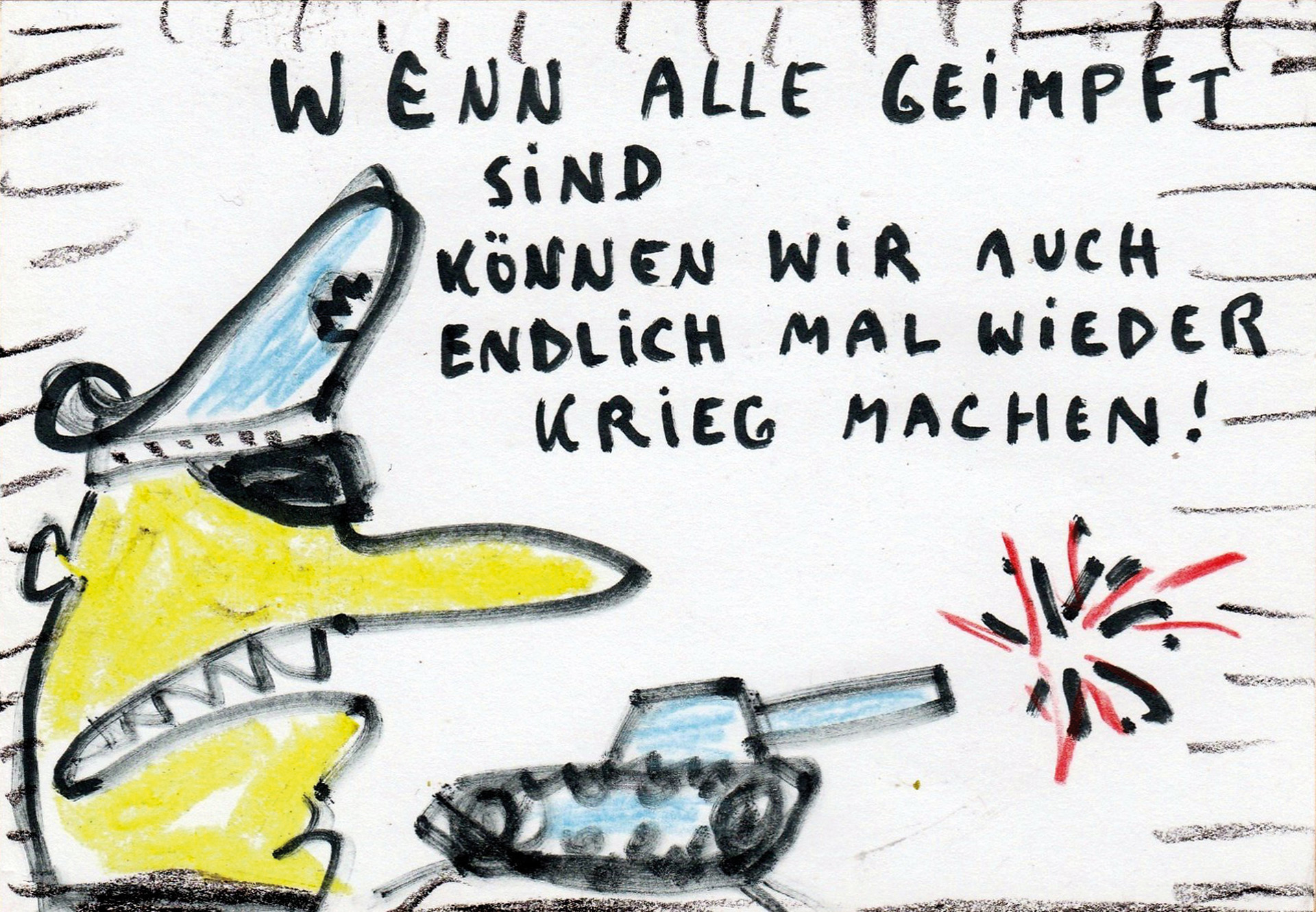 Der Maler Oskar Manigk hat in fünf Jahrzehnten unzählige Zeichnungen und Postkarten angefertigt und verschickt. Mail Art ist Post-Kunst, sie will in die Welt, wird aber auch in Archiven bewahrt. Karten von Manigk erschienen ab 1980 in Editionen u.a. bei Jürgen Schweinebraden. Mit Ironie und tragischem Humor schaut Oskar Manigk auf die Realität. Prangerte er zu DDR-Zeiten Einschränkungen von Rede- und Reisefreiheit, Aufrüstung und Umweltverschmutzung an, sind es heute Coronamaßnahmen und Kriegstreiberei.
